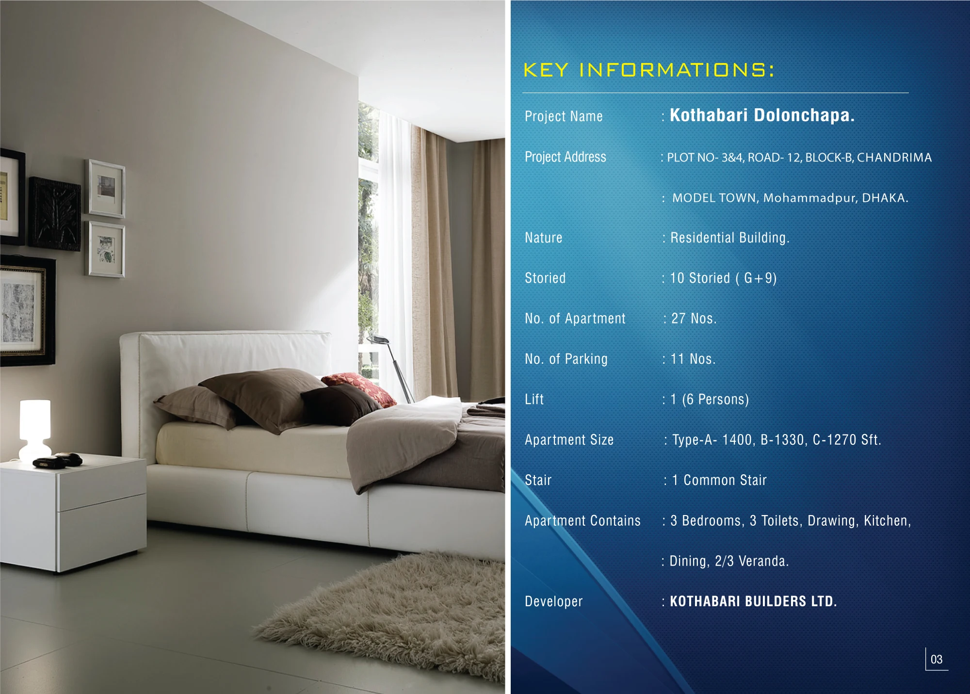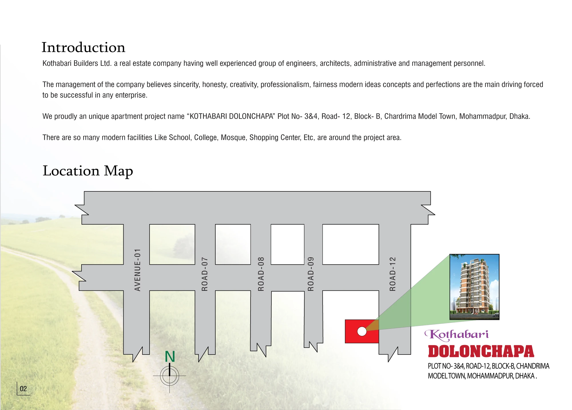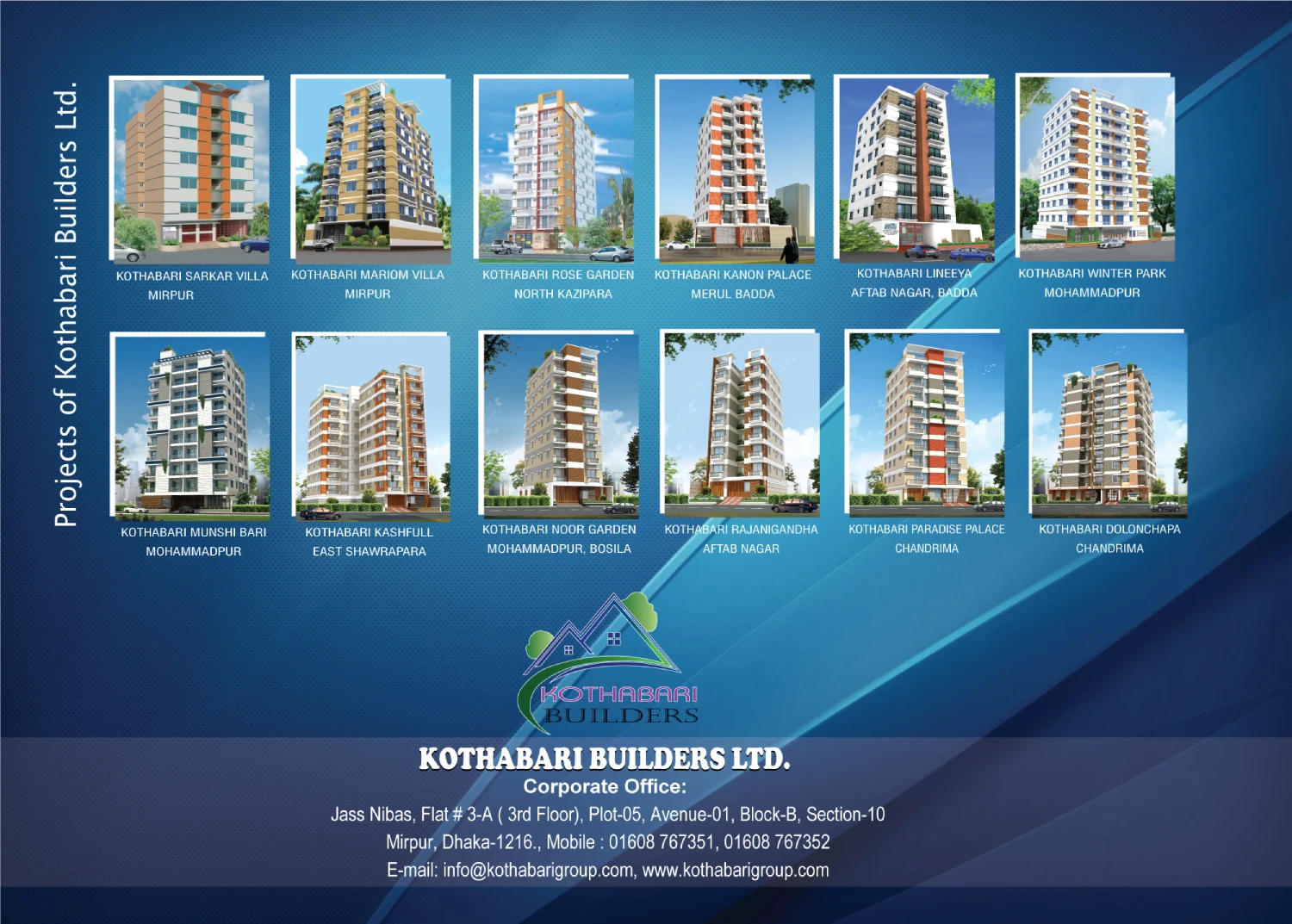 Visit Kothabari Builders Ltd. today and explore modern, well-designed apartments with open surroundings and easy access to any part of Dhaka city. Located beside the Gabtoli–Mohammadpur main road, the project stands next to the Chandrima Model Town Central Mosque and shopping mall, featuring an elegant architectural design.