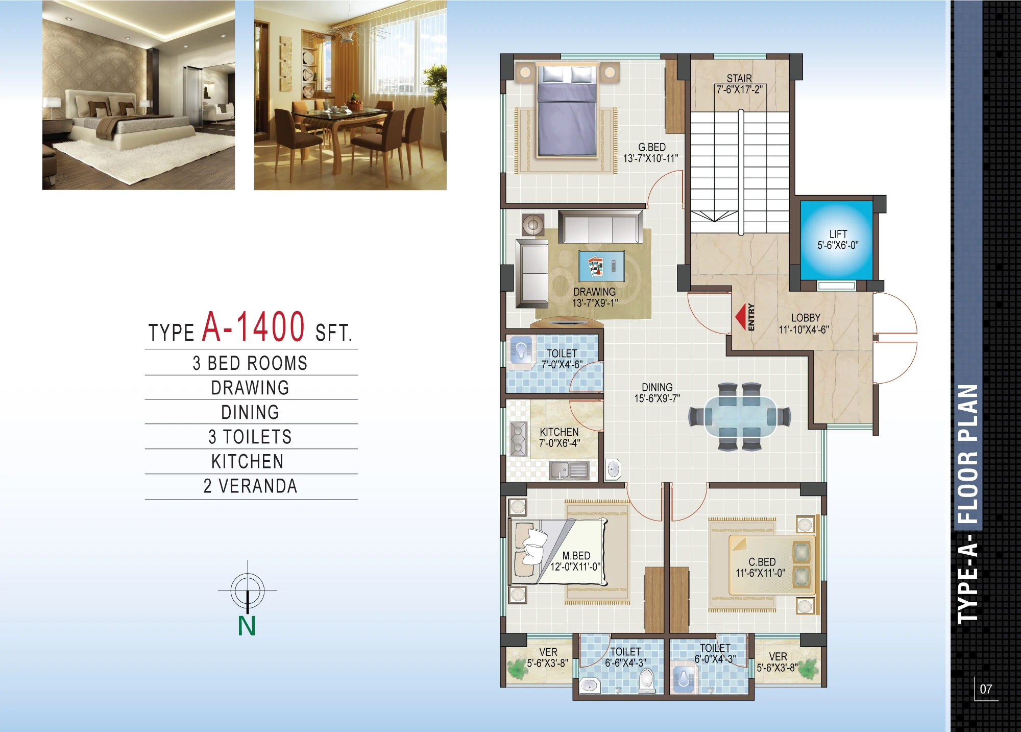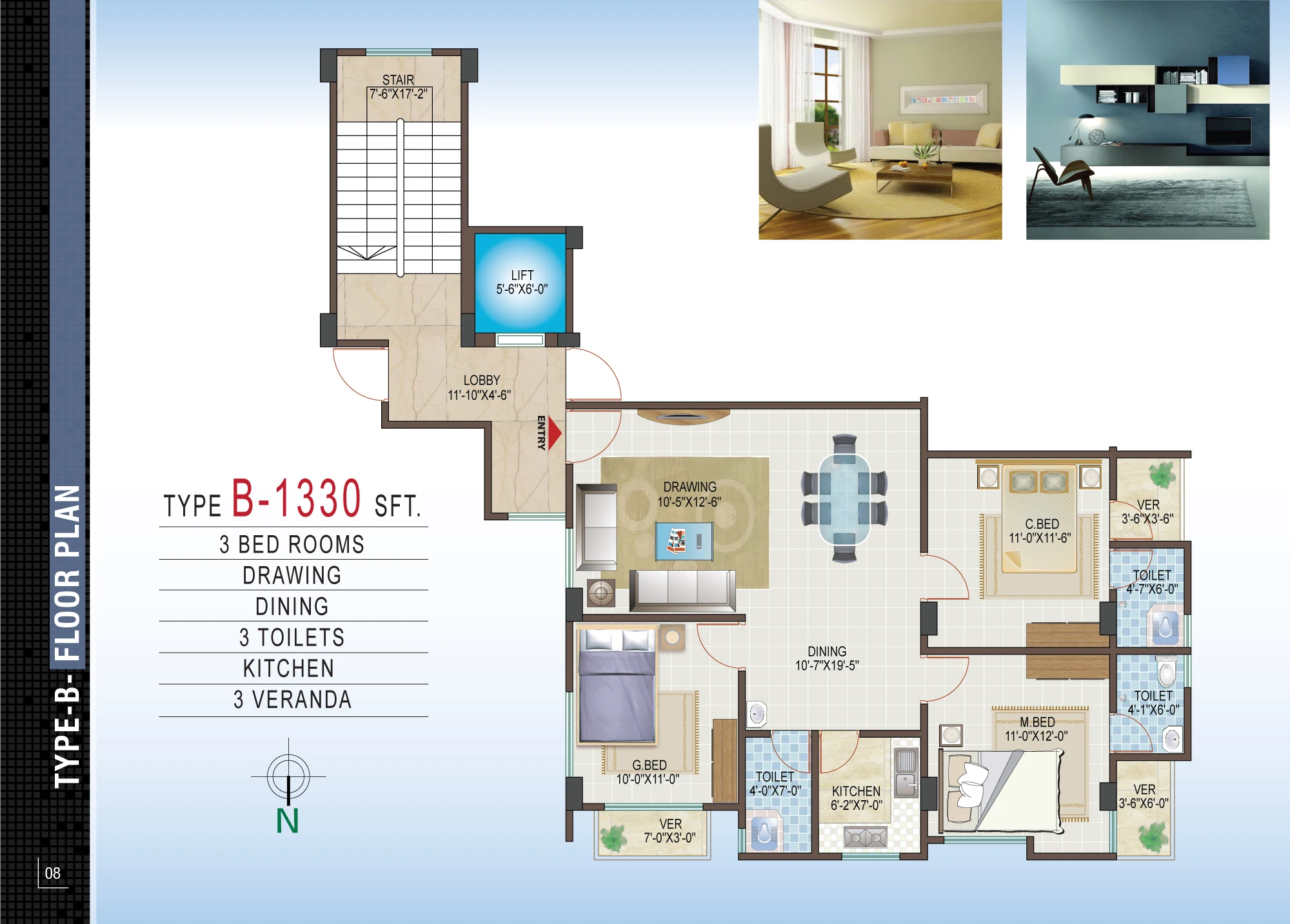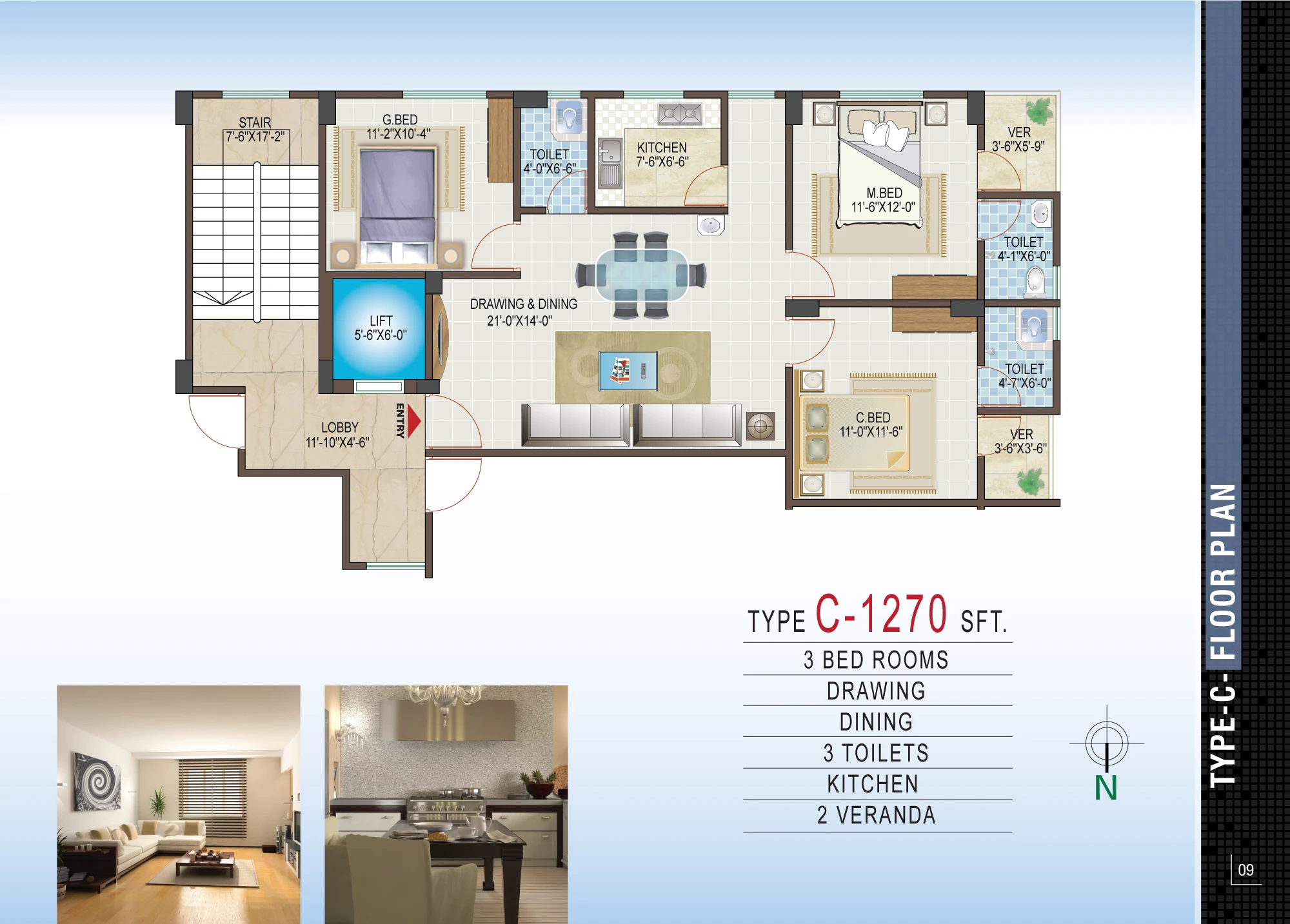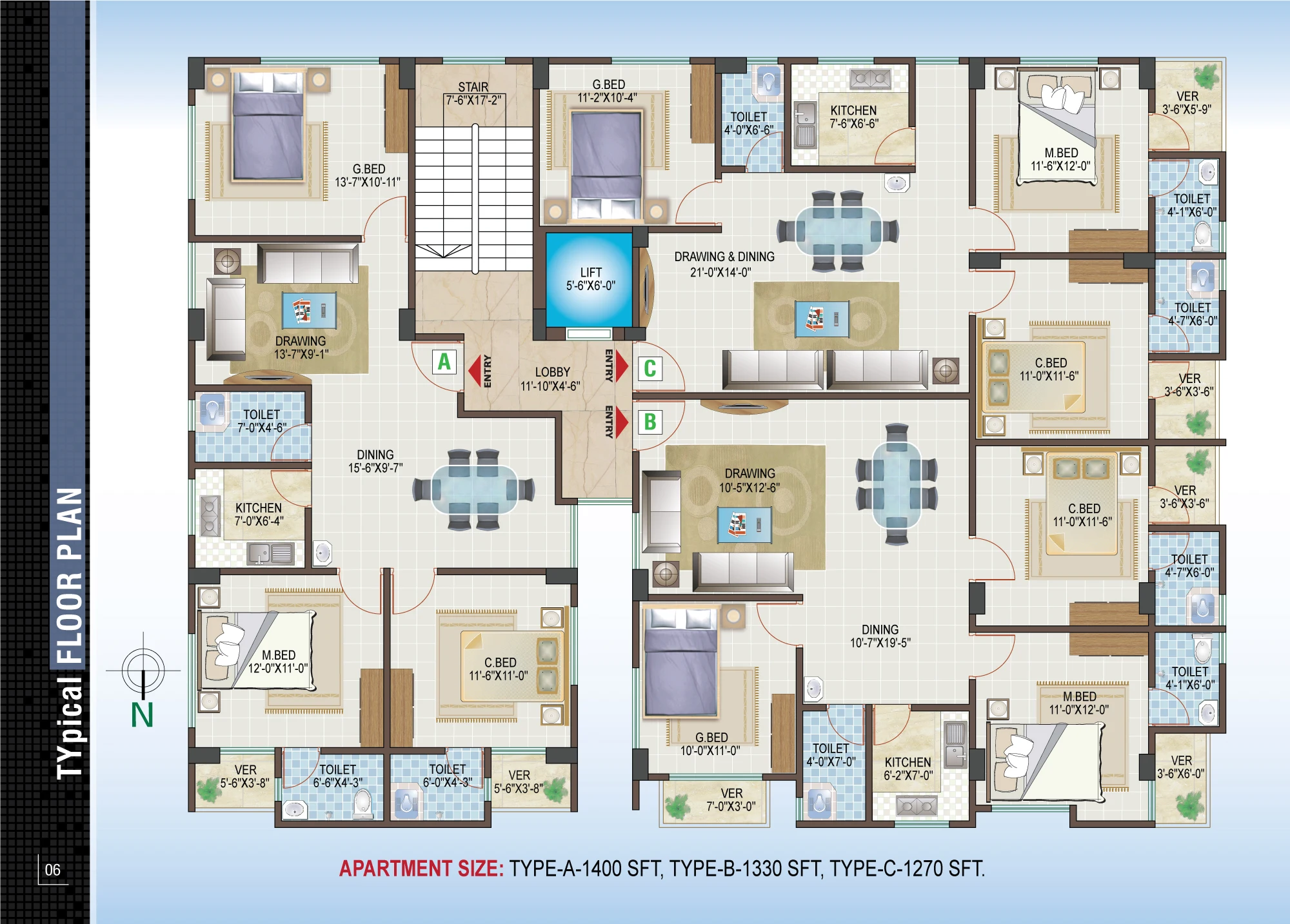 Unit A (1400 sft): 3 bedrooms, 2 verandas, 3 bathrooms, drawing & dining Unit B (1330 sft): 3 bedrooms, 3 verandas, 3 bathrooms, drawing & dining Unit C (1270 sft): 3 bedrooms, 2 verandas, 3 bathrooms, drawing & dining