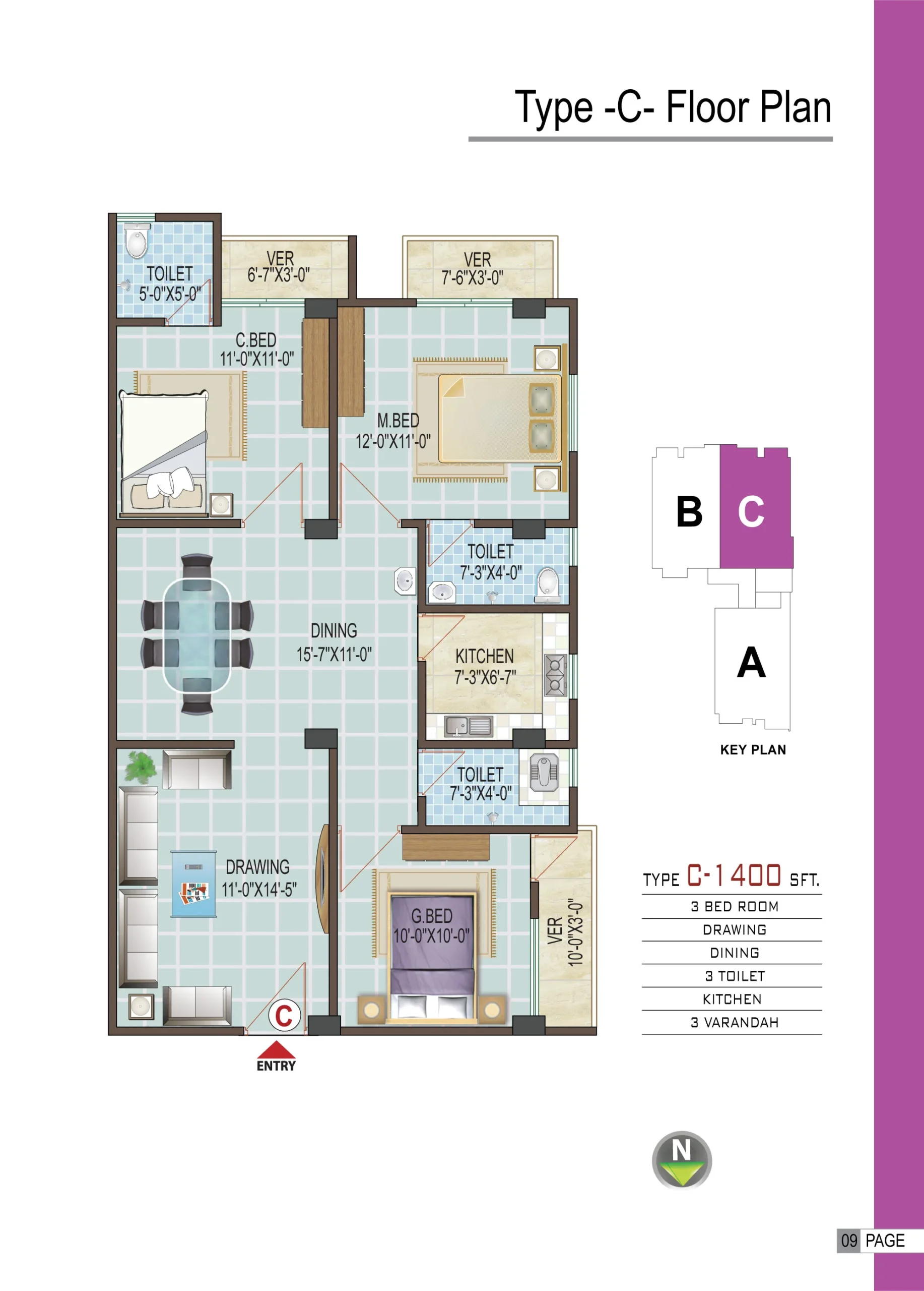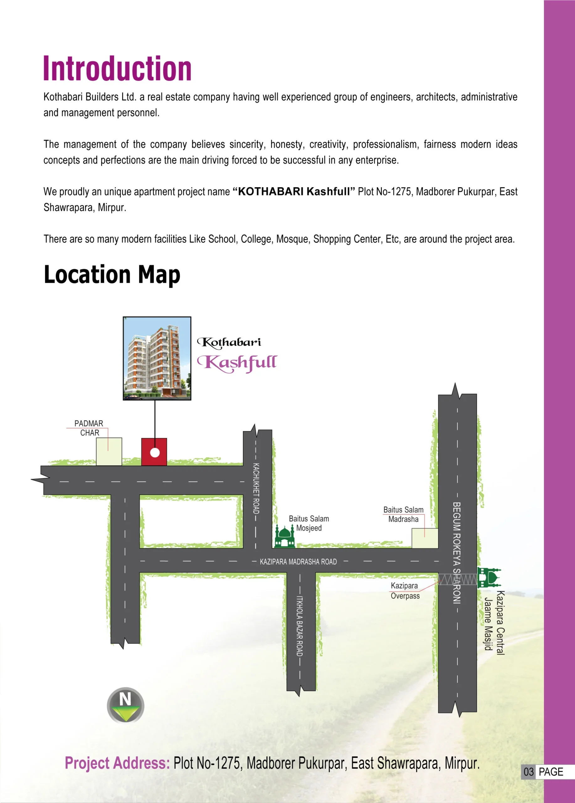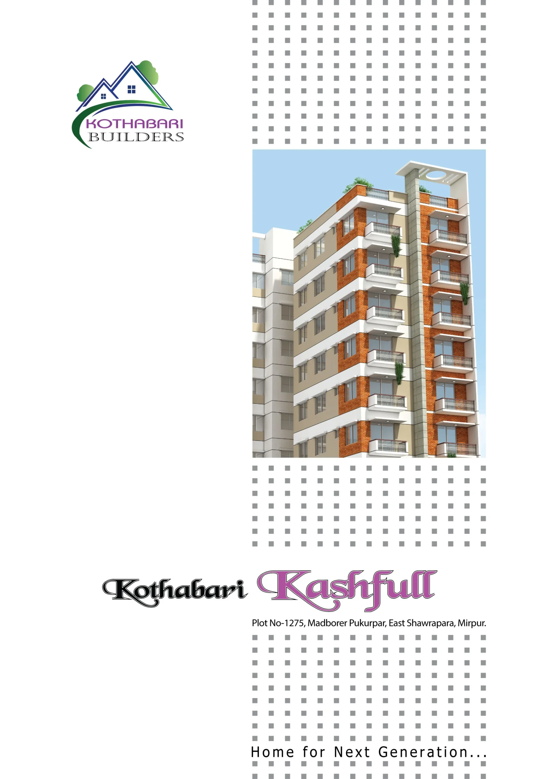 Kothabari Kashful is a north-facing G+9 storied residential project located beside Baitus Salam Jame Masjid. It offers 1400–1450 sq. ft. 3-bedroom apartments with modern facilities including lift, generator, and water supply.